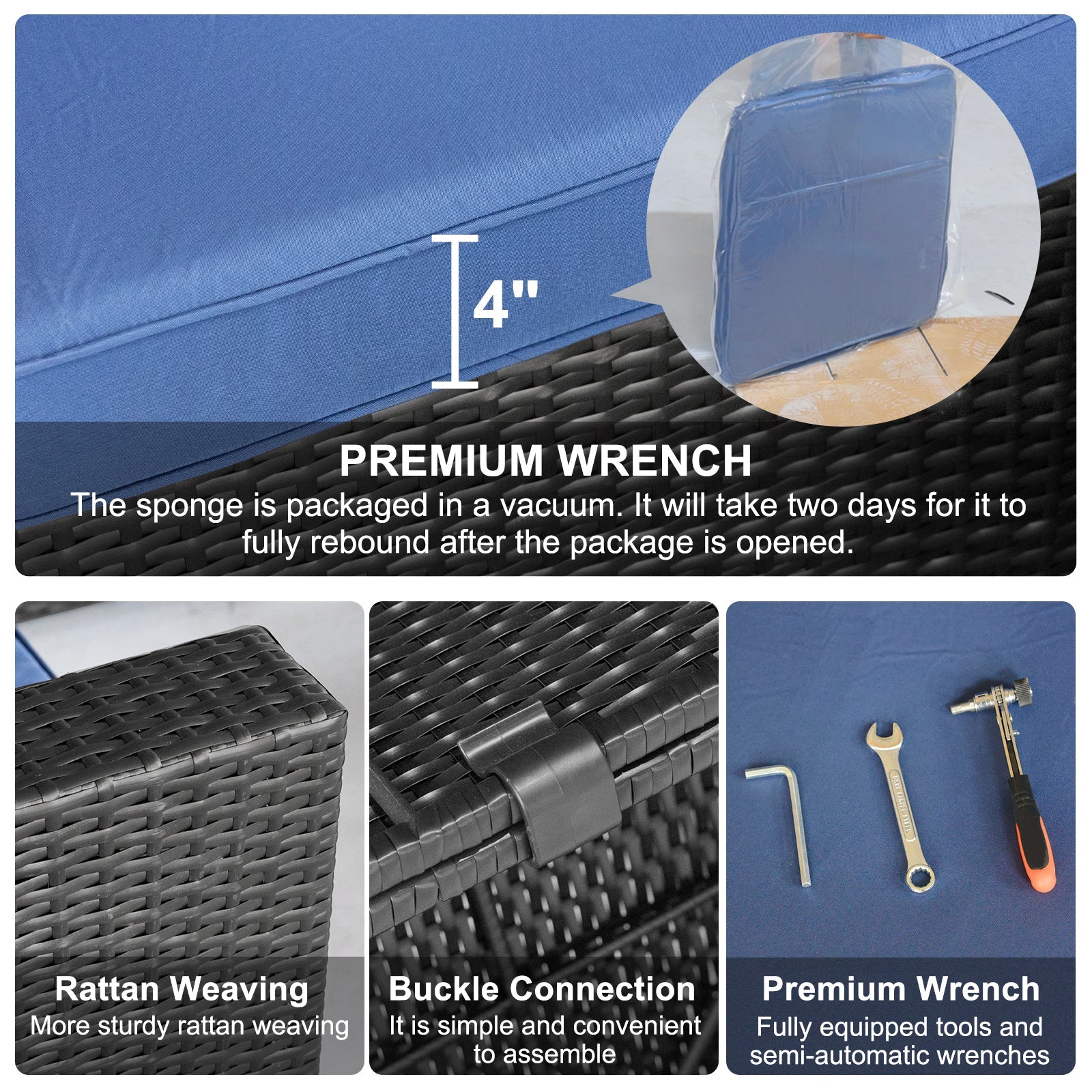 - Patio Furniture Set: Our patio furniture set comes with 4 inches of soft sponge cushions, providing you with great comfort. This outdoor patio furniture set is suitable for both indoor and outdoor use, ideal for poolside, garden, patio, terrace, backyard, porch, balcony, etc.