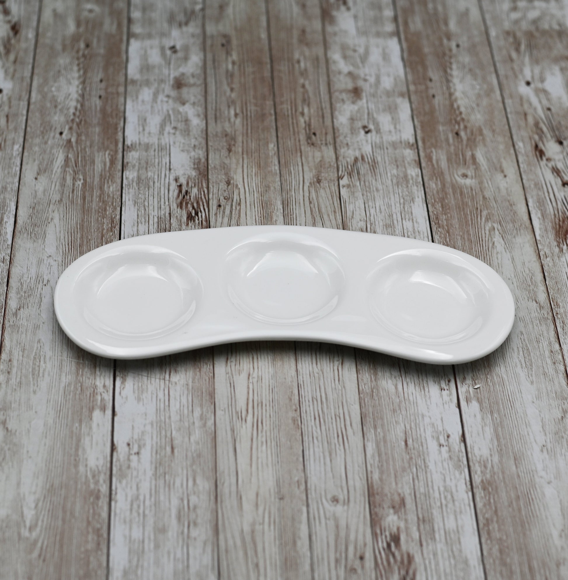 - Fine Porcelain half circle tray and matching miniature round dishes (saucers) are made of pure soft white raw material allows our porcelain to be both functional yet durable for everyday use. Wilmax double-fired porcelain is truly vitrified for added strength and durability Dishwasher, Microwave, and oven safe to 400 Degrees.