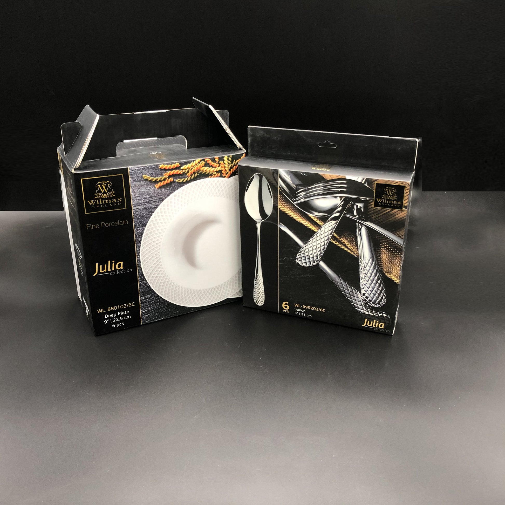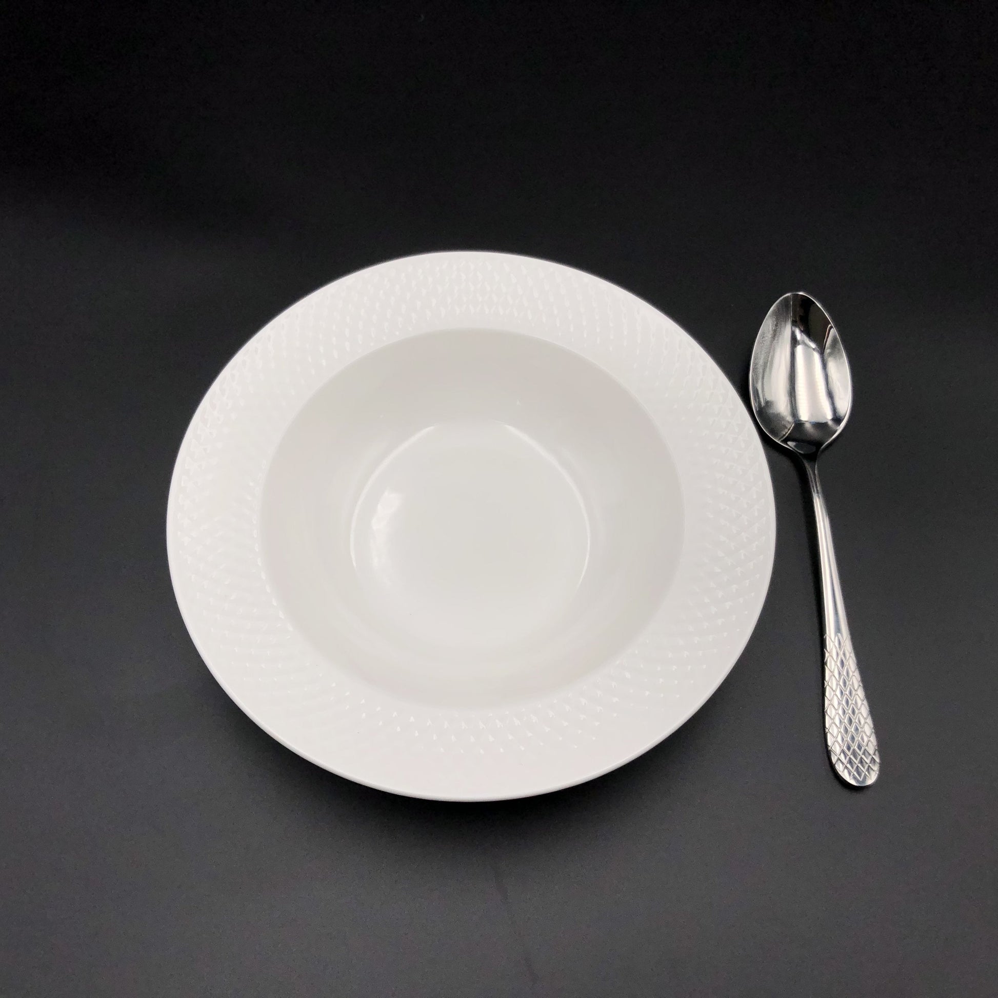 - Fine Porcelain Julia 12 piece deep soup plate set allows the most elegant 6 person plate setting you can imagine. With herringbone embossed effect around the rim of the plates and spoons to match.