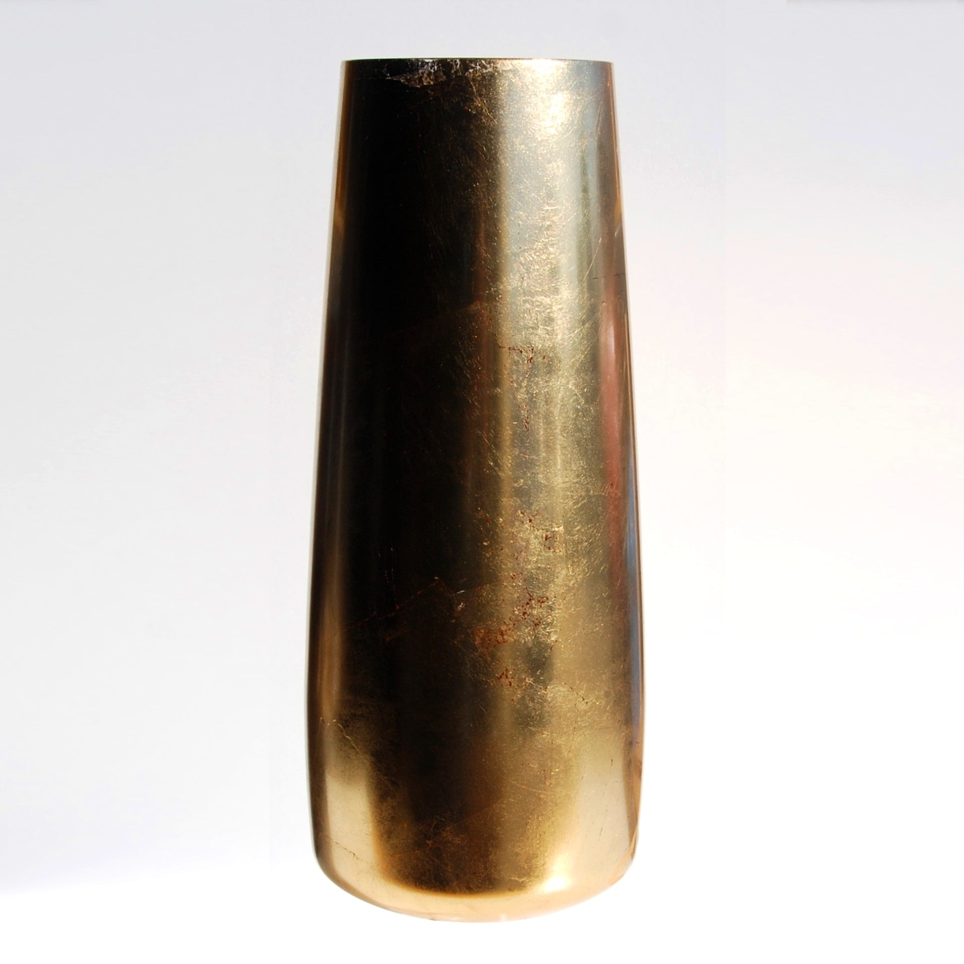 18" high mouth blown Zen Vase hand gilded using gold leaves with a distressed finish. Can be used as a floor vase or a gorgeous centerpiece for your special occasions. Metal leaf details enhances the simple yet sleek and contemporary look. Glass vase imported from Europe and hand finished in USA.