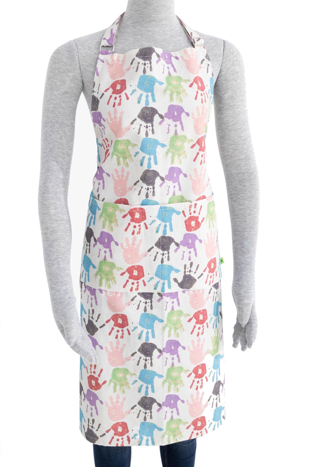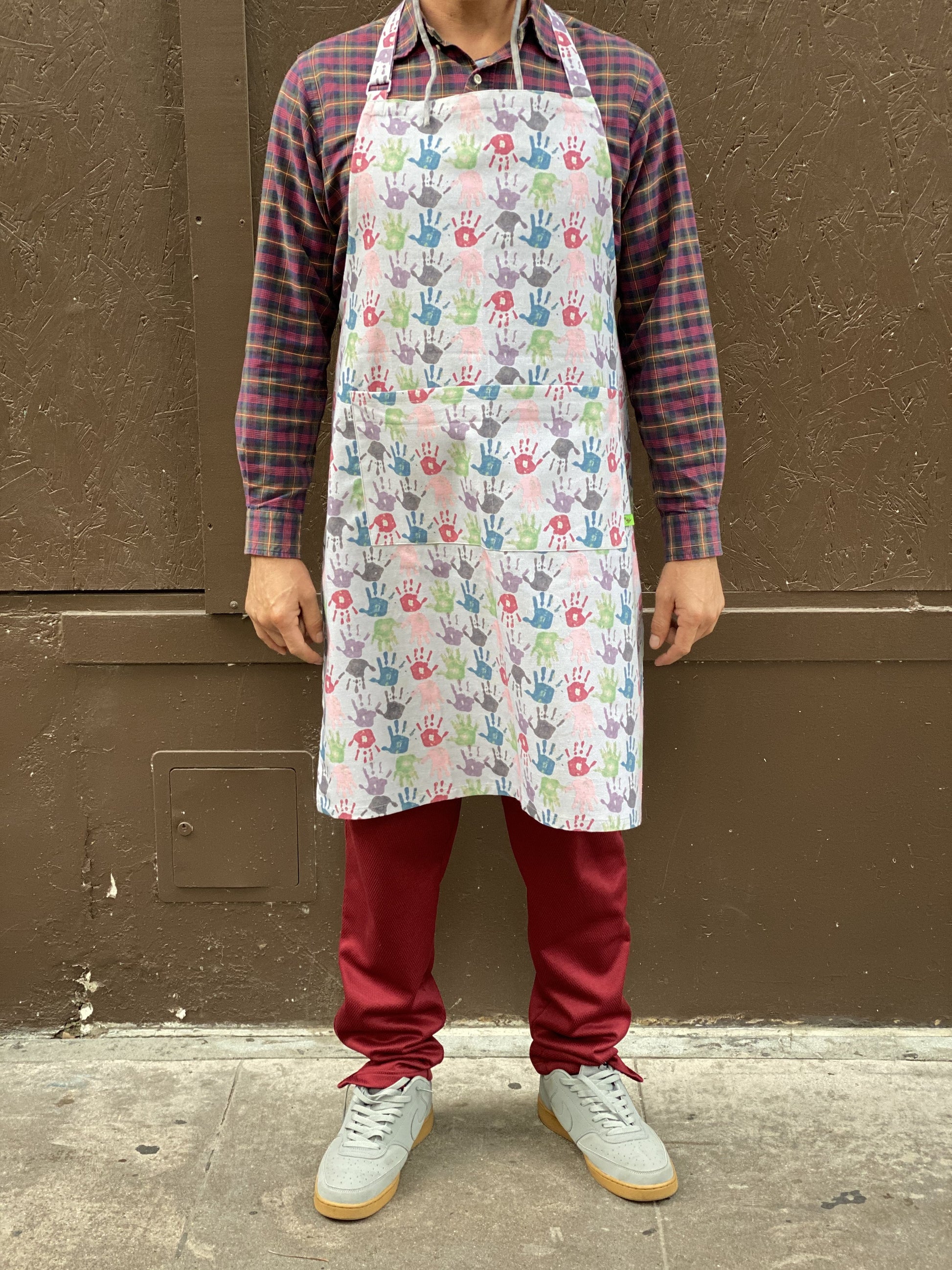 100% cotton apron fits both mom and dad. Hands print designed by Adrian Laine age 5! A portion of all sales is donated to the designer's college fund. Wash cold and lay flat to dry. Made in USA, baby! Free mask included with purchase while supplies last!