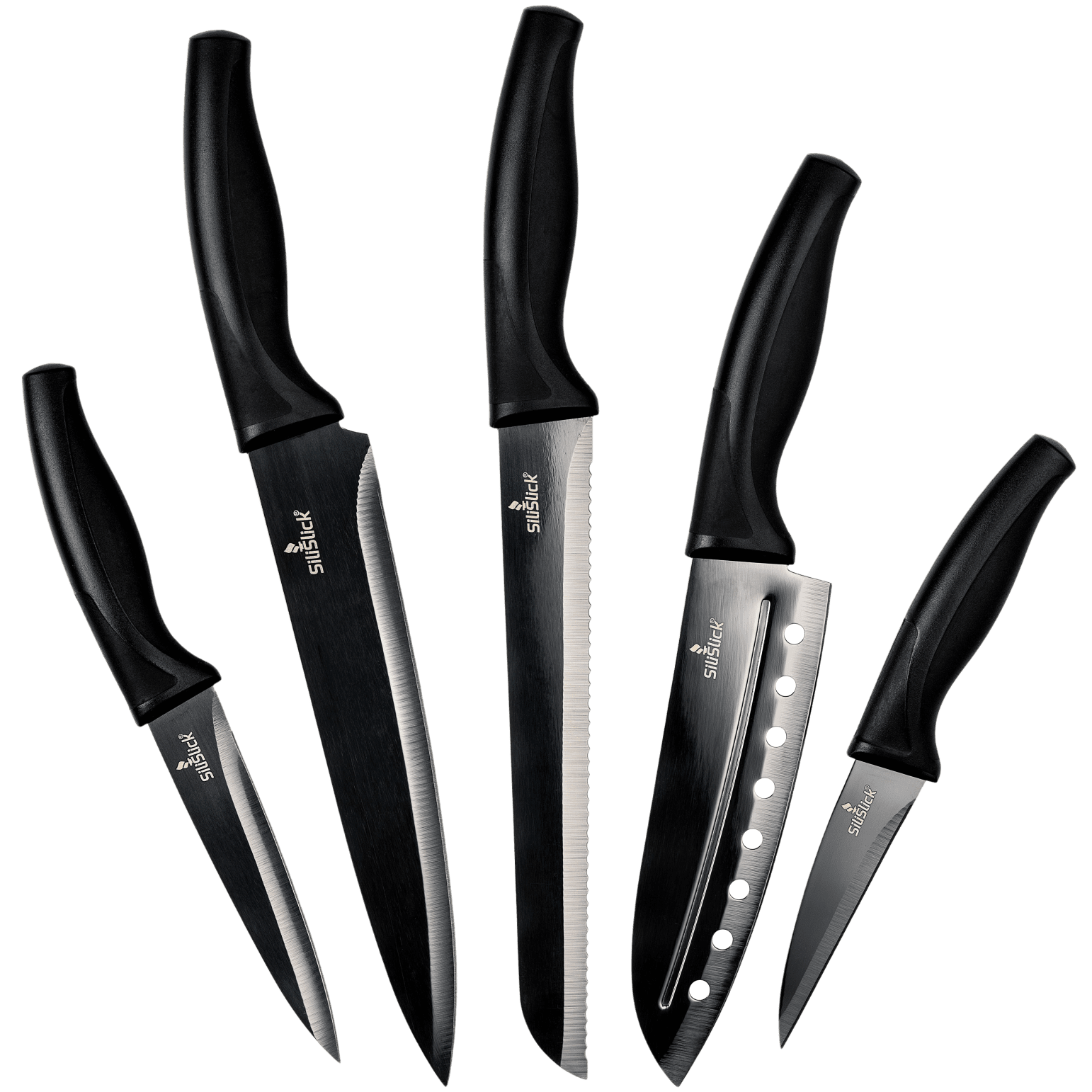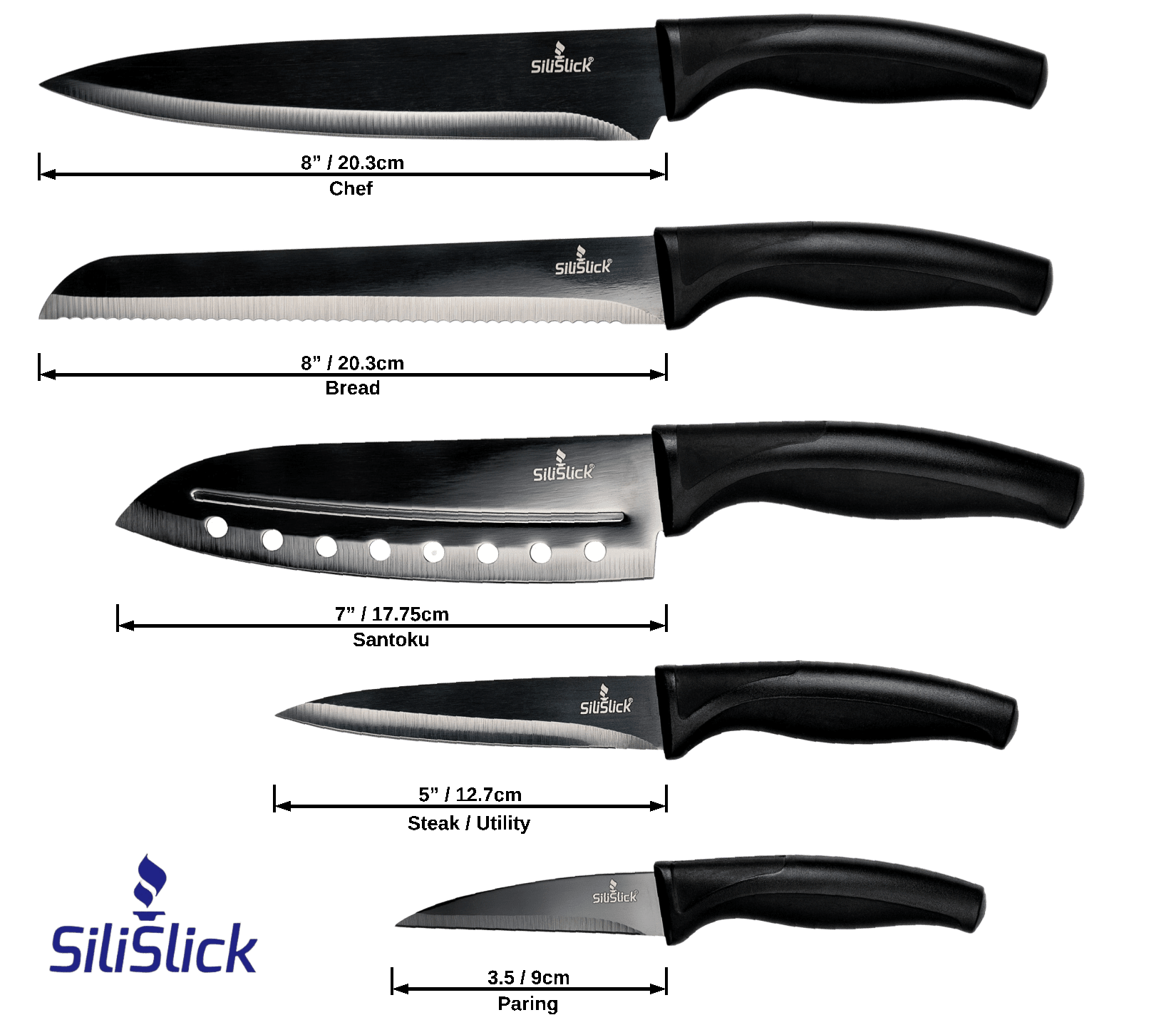 🔪 FOOD GRADE STAINLESS STEEL : Experience exceptional durability and performance with our food grade stainless steel knives. Crafted from superior quality stainless steel, each blade is finely sharpened and plated with non-stick titanium for a colorful, iridescent finish that adds a touch of style to your kitchen. This knife set includes a 20.3cm/8" Chef knife, 20.3cm/8" Bread knife, 17.75cm/7" Santoku knife, 12.7cm/5" Utility knife and 8.9cm/3.5" Paring knife