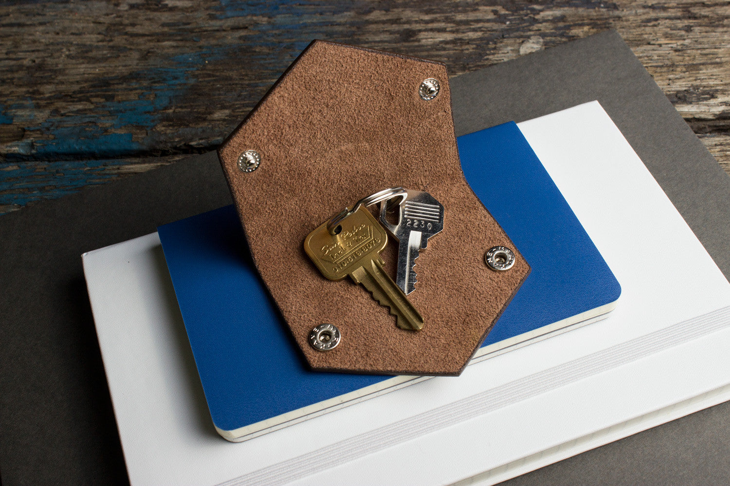 Our Leather Key Case is hand crafted with richly textured cowhide leather giving it a rugged exterior finish. The Case also features a button snap closure with a key ring included.