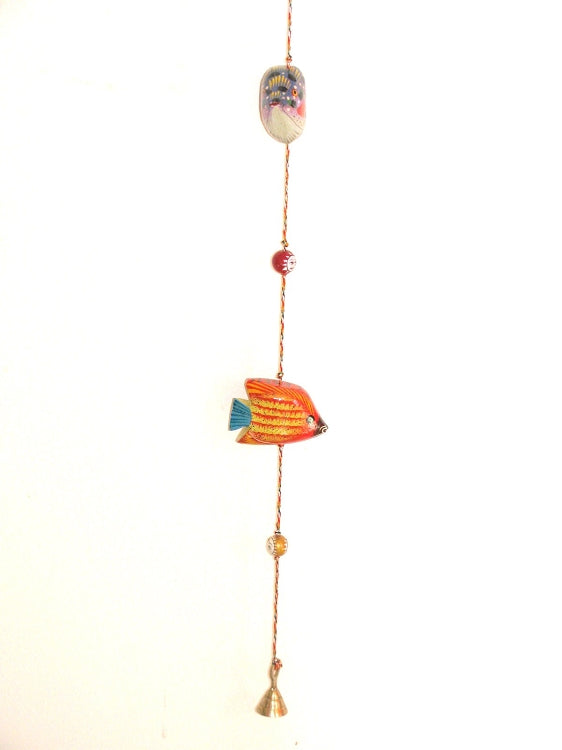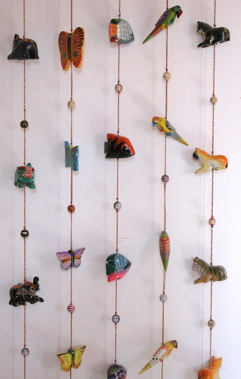 The eye-catching animal figure is beautifully hand-painted with the finest oil-based paints in vibrant colors, detailed finish, and glaring texture. Colors used are water-proof and does not lose their shine to dust, sunlight, normal wear and tear. A single string with an animal figure that is made of softwood is Hand carved with a brass bell at the bottom. The choices available in animal bells are Fish, Birds, and Butterfly. In between the animal figurines, the string has wooden beads. Each string is sold separately.