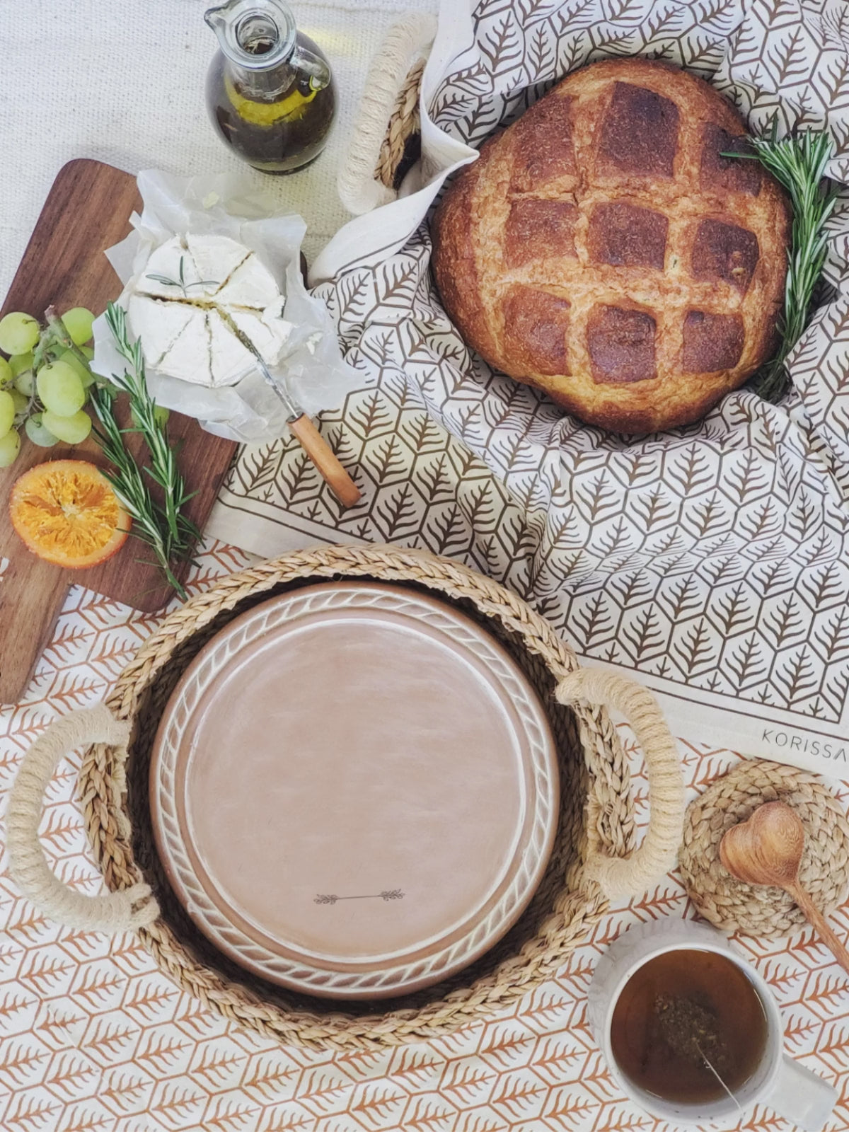 (1) Terracotta Breadwarmer, (1) Seagrass basket and (1) Tea towel of your choice.