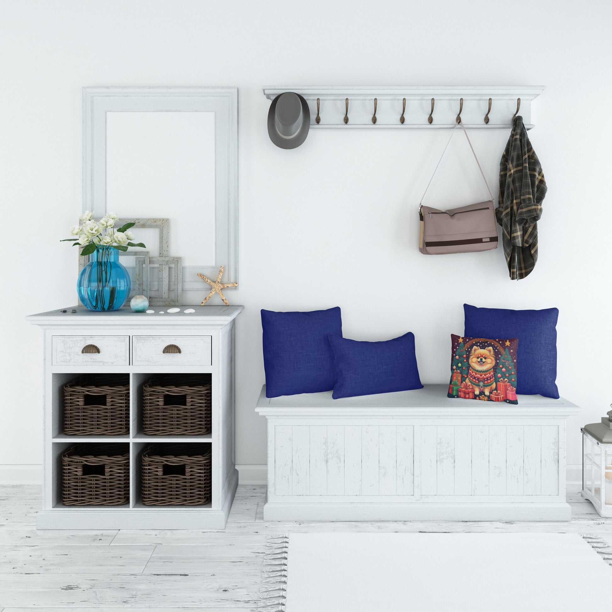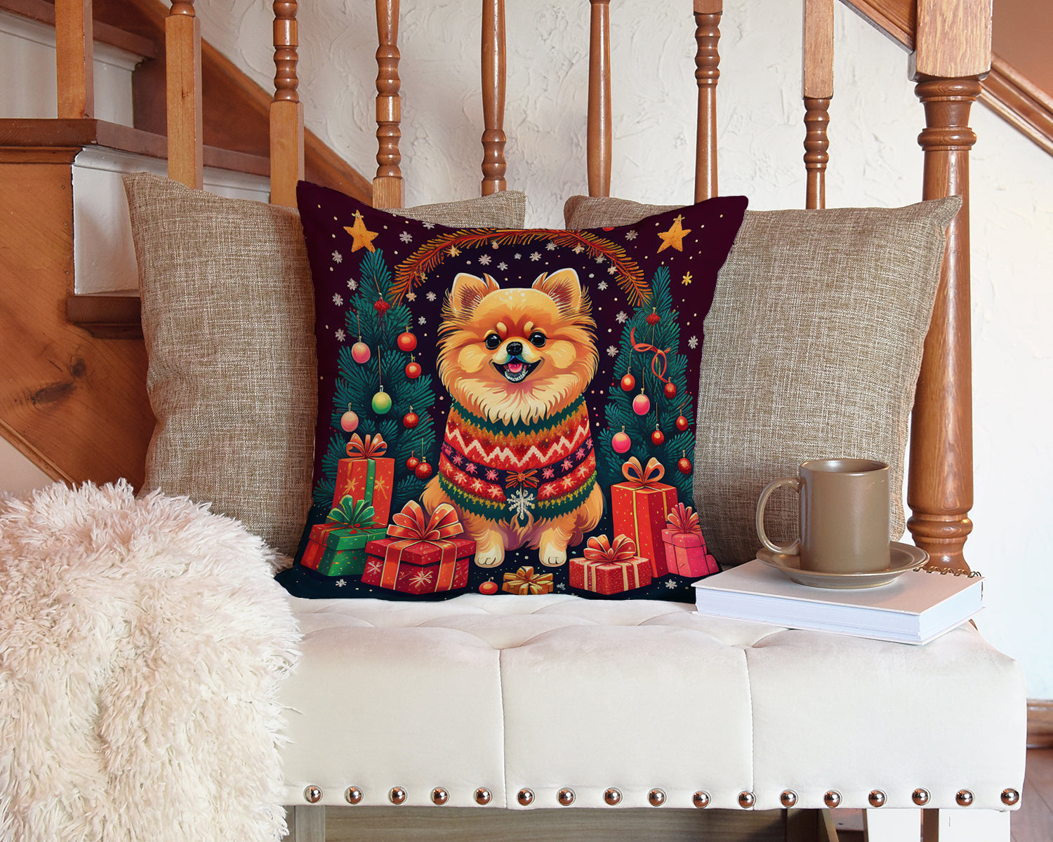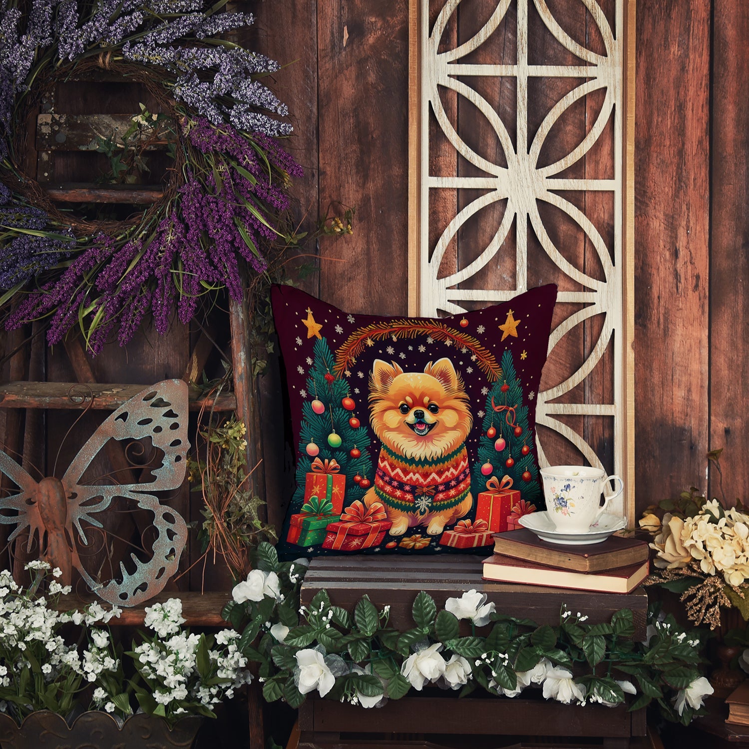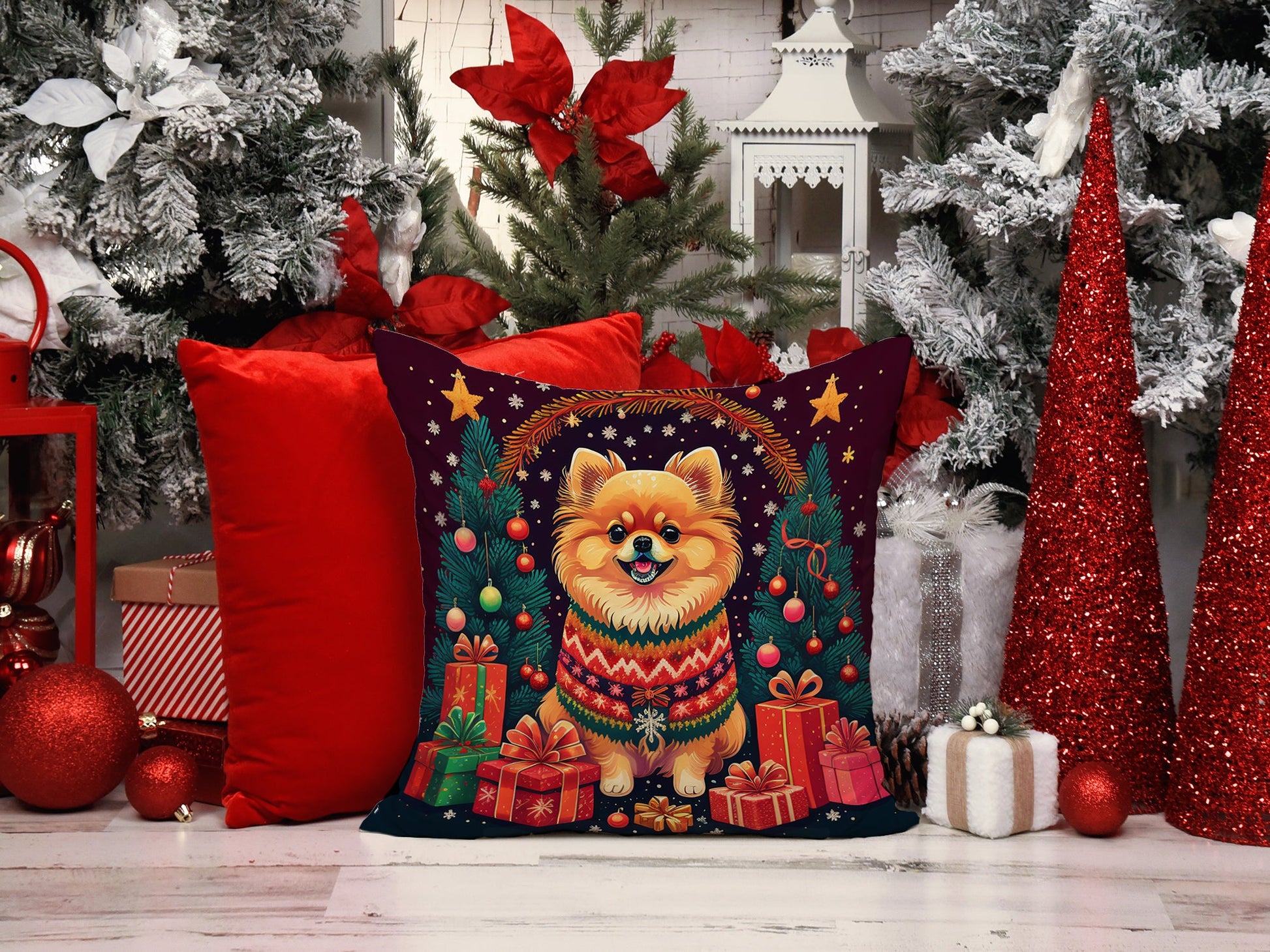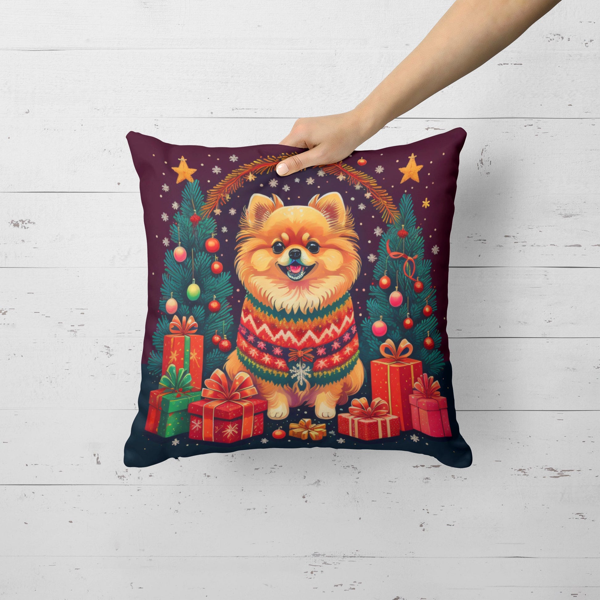 Throw Pillow featuring breed specific Pomeranian artwork. Celebrate Christmas with this Christmas Pillow. Add a touch of vibrancy and comfort to your outdoor seating with Caroline's Treasures Fabric Decorative Pillow. Measuring approximately 14 inches by 14 inches, this outdoor pillow is crafted to elevate the appeal of your patio furniture, infusing it with vivid color and artistic flair. The pillow includes a 100% Polyester Fabric sham filled with a quality pillow form to provide superior comfort. Innovatively made from our brand new material, specifically woven for its water resistance, this pillow is designed for durability. The soft canvas fabric offers versatility in use, fit for your indoor couch or your outdoor patio, porch, or veranda. The fabric is dyed with colorfast dyes built for resilience against weather conditions, ensuring the pillow retains its beauty over time. Constructed by sewing three fabric pieces to create a sham, the polyester insert is then nestled inside to form the pillow, resulting in an overstuffed pillow that maintains its shape. Both the sham and the pillow insert are proudly made in the United States. As the pillows are handcrafted, there may be minor variations in size, further enhancing their unique charm. Experience comfort in style with Caroline's Treasures Fabric Decorative Pillow.