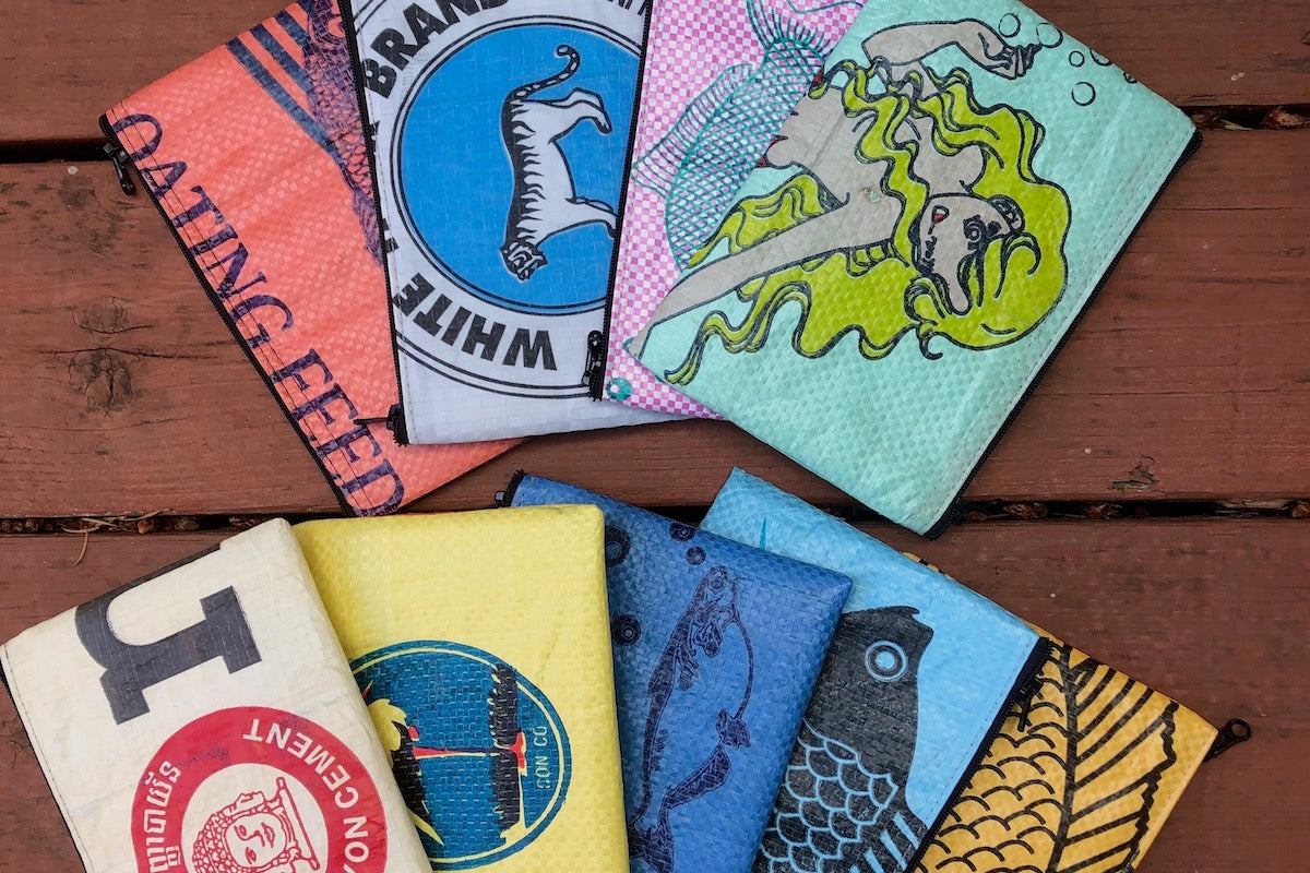 - Exterior material is upcycled from feed and cement bags, Interior material is recycled from plastic bottles