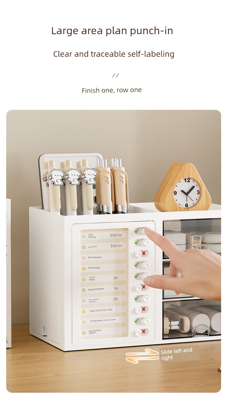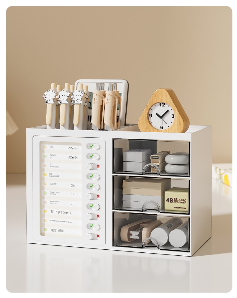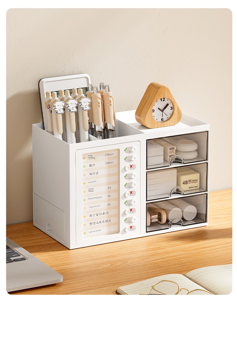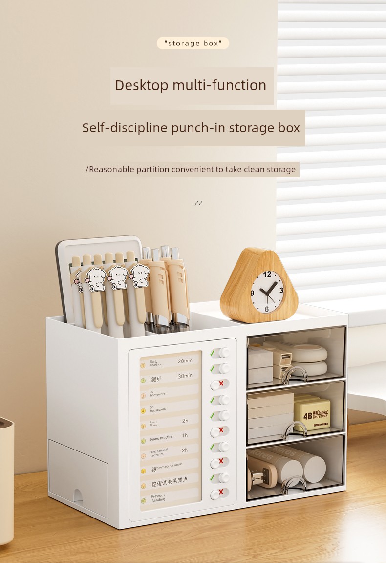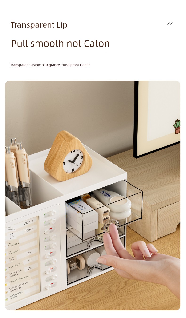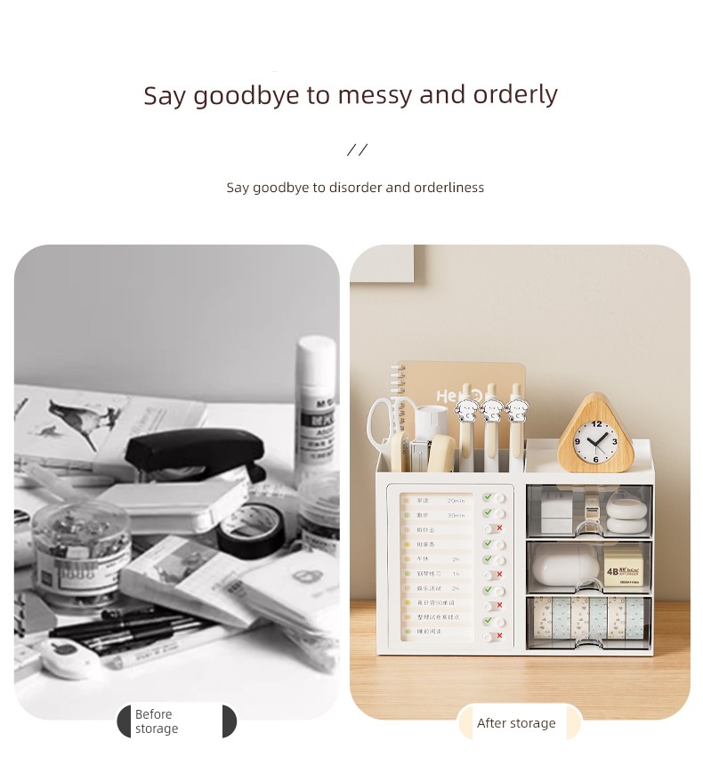 β¨ Keep It Organized! β¨ What is it - Meet the ultimate Student Desk Organizer, designed for primary school students to enhance their self-discipline! This stylish storage box features a practical drawer and compartments for all your school supplies, from pens to notepads. π Why do you need it: - Promotes self-discipline by encouraging organization. - Reduces clutter and keeps your workspace tidy. - Ideal for students, helping them manage tools efficiently. - Perfect fit for any office desk or studying environment. β€οΈ Why you love it: - Sleek, modern design that complements any decor. - Durable materials ensure long-lasting use. - Versatile functionality for both students and adults. - Effortlessly stores all your essentials at arm's reach. π οΈ How to use it: Simply place all your stationery items in the compartments and utilize the drawer for bigger items! It's designed to fit seamlessly on your desk, maximizing your space. β