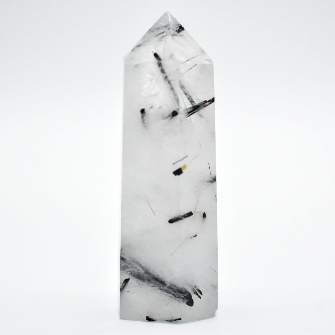 Tourmalinated quartz is Black Tourmaline growing inside Quartz! A powerful combination and one of the most sought after stones this year. Remove negative energy and amplify your intentions at the same time. This point is also a hexagon point, which pulls in sacred geometry. One of the most powerful of the shapes-the #6 represents communication, unity, love, integration, perfection, sincerity and truth.