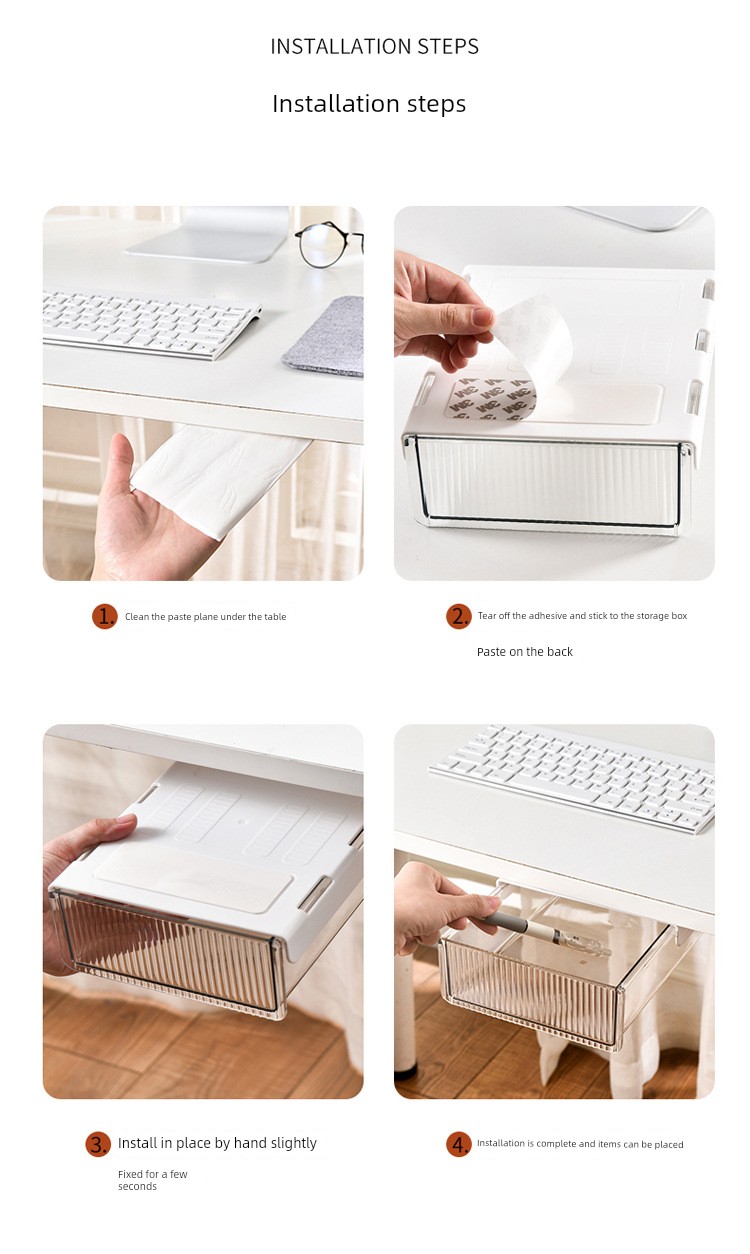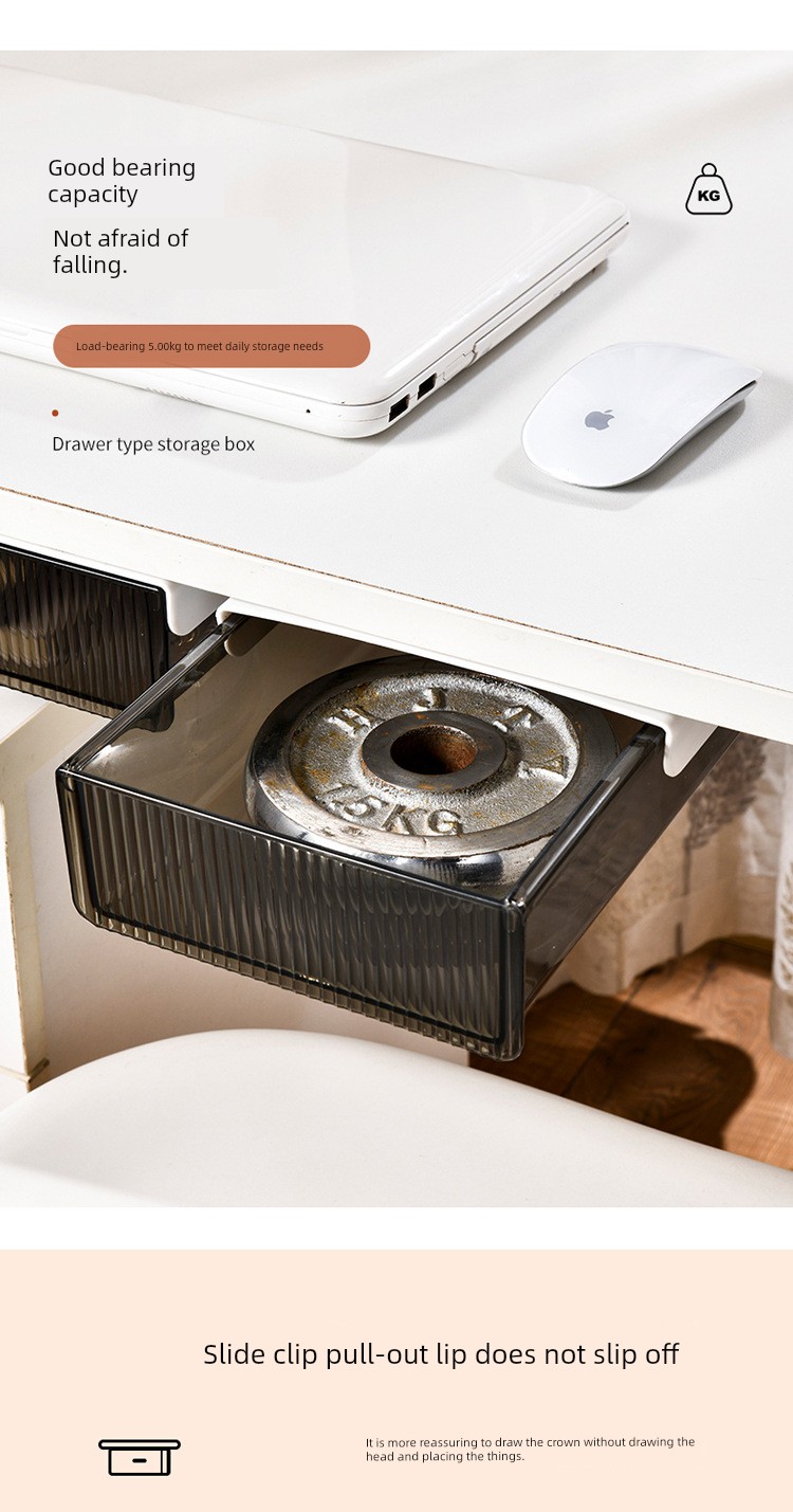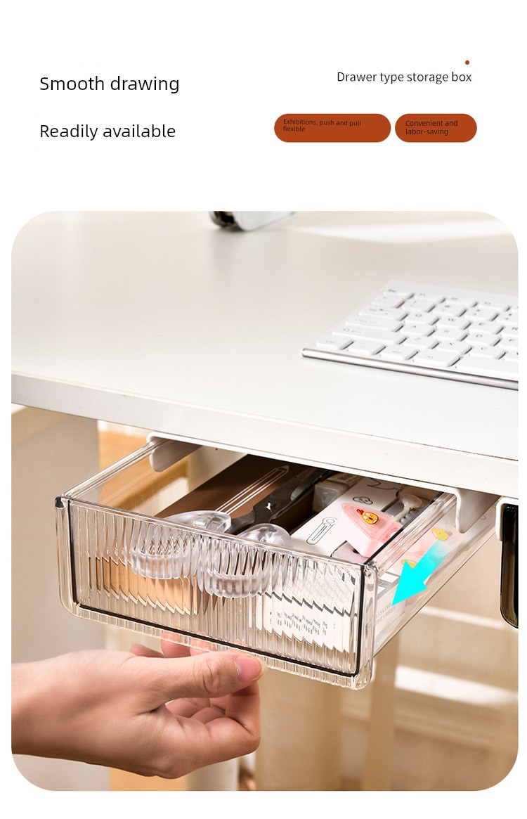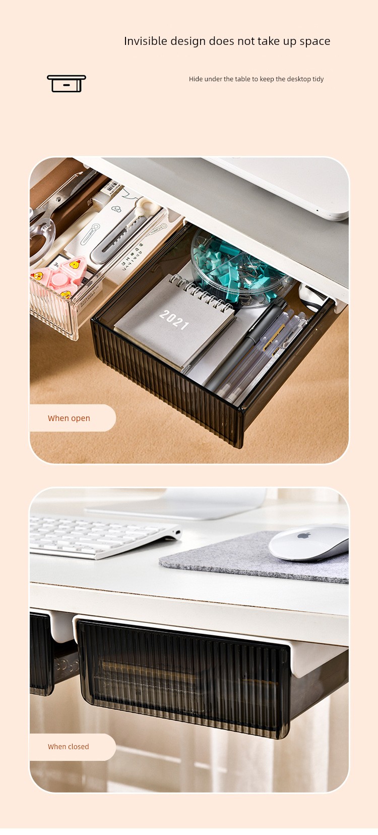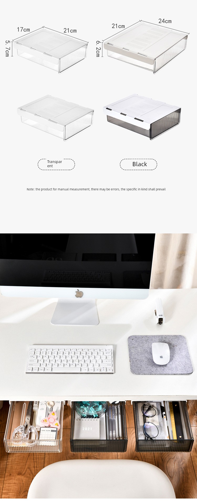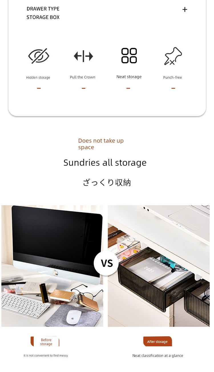 Keep your workspace organized! β¨ποΈ What it is β Our under desk punch-free drawer-type storage box is the perfect solution for a clutter-free office. This sleek hidden pen holder and sundries organizer is designed to maximize your space while keeping all your essential stationery within reach.π― Why you need it: - Prevents clutter and disorganization in your workspace. - Easy accessibility for all your office supplies. - Punch-free installation means no damage to your desk. - Premium design fits seamlessly under any desk. - Keep essentials like pens, scissors, and notepads at hand for ultimate productivity.β€οΈ Why youβll love it: - Convenient solution for on-the-go organization. - Sturdy construction ensures it holds all your desk essentials without sagging. - Versatile design complements any office dΓ©cor. - Great for both home and professional environments.π οΈ How to use it: Simply peel and stick to any clean, flat surface under your desk. Load it with your favorite office supplies, and enjoy a clutter-free workspace! π Guarantee: Enjoy a limited-time offer on this best seller! Transform your workspace today with our exclusive under desk storage box and experience essential organization at your fingertips!
