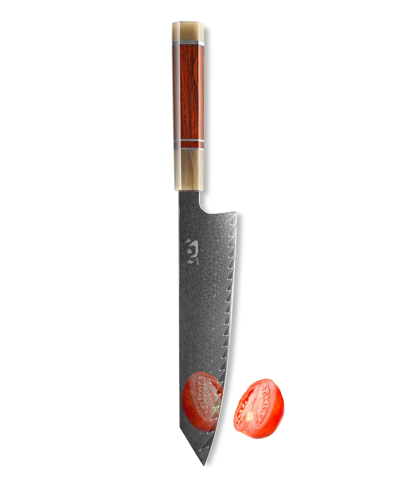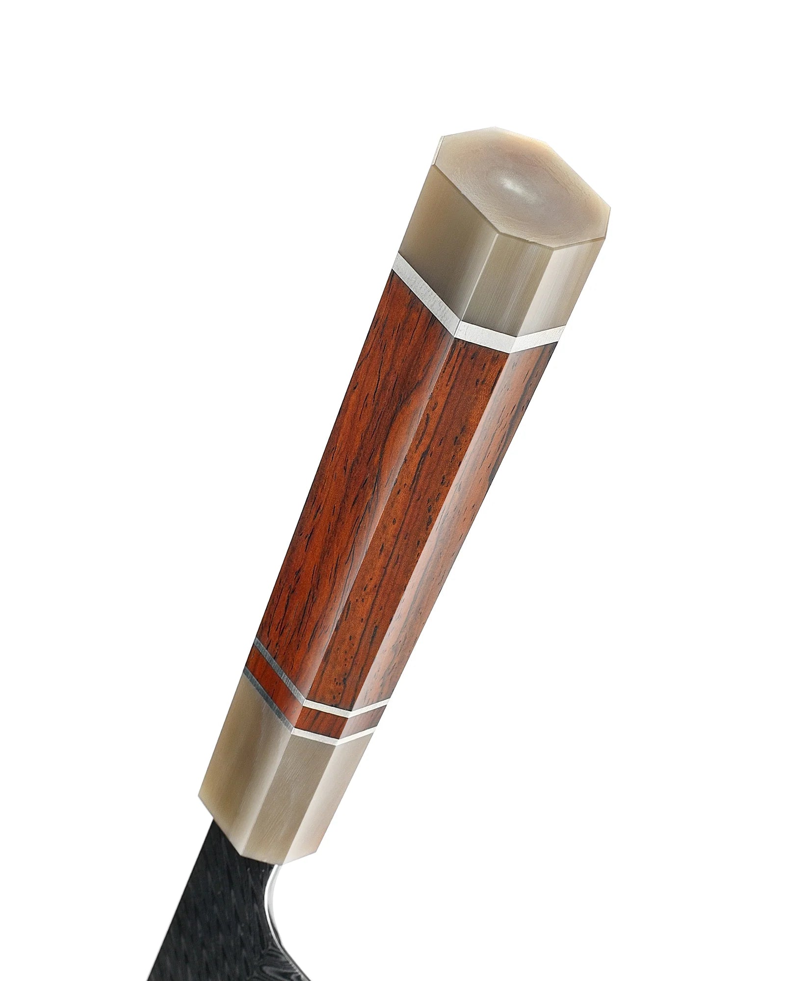This knife is a handcrafted 8" Japanese style kiritsuke. A kiritsuke always helps slice meat, vegetables, fish and cooked food with comfort and ease. This knife is handcrafted by very experienced craftsmen with decades of experience of knife hand-making. The blade is 67 layer VG10 damascus steel featuring a forged and highly mirror polished finish. The fine convex grind of the edge forms a nice arcuate shape and an extremely sharp performance. We also apply rosewood and buffalo horn, jointed with nickle silver for the handle. With the simple and classic design, the whole body applies a full tang structure to achieve the best balance and longest using durability.